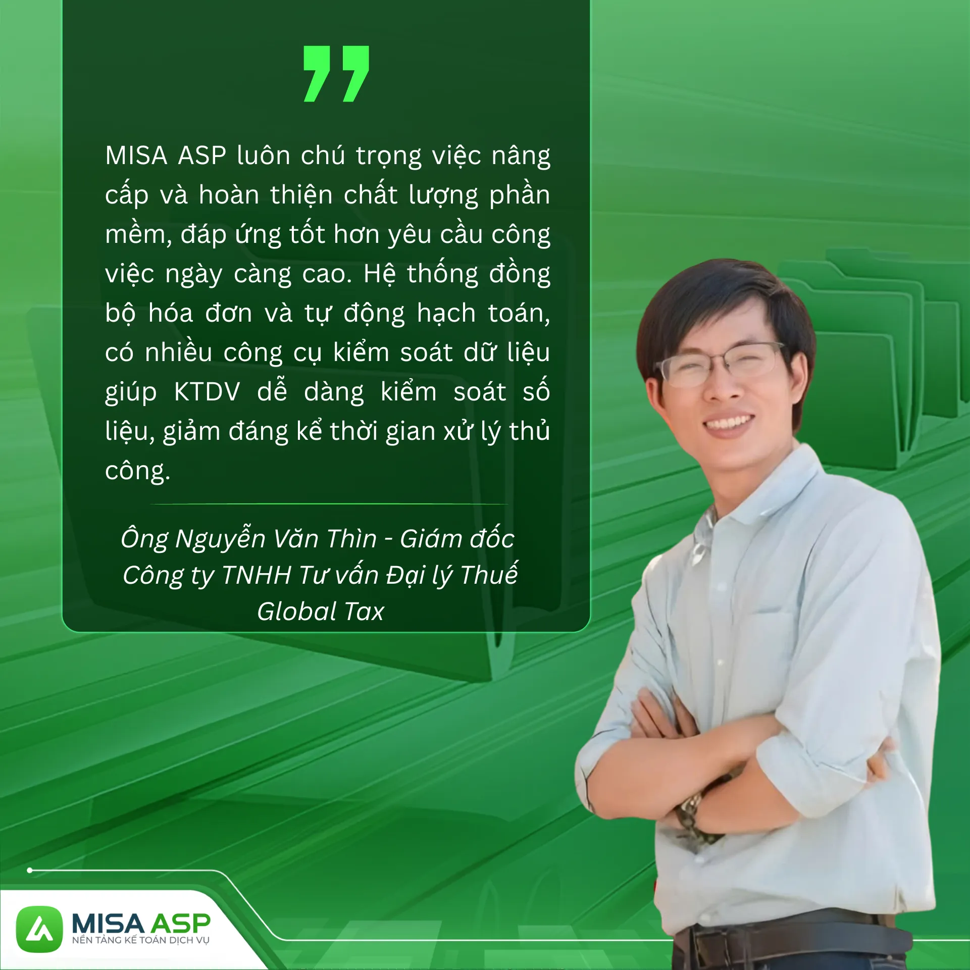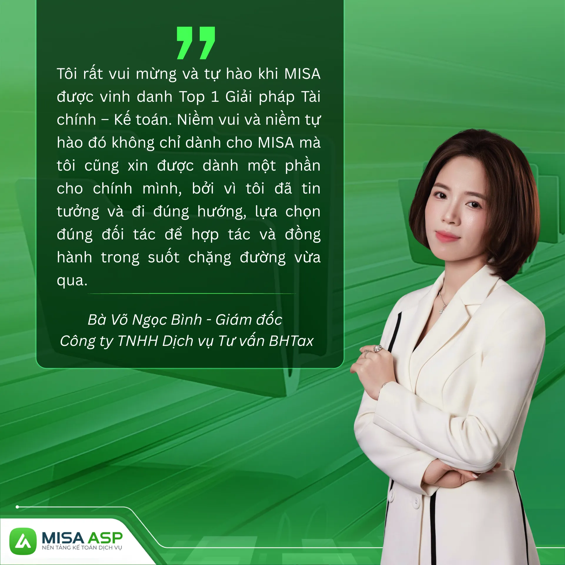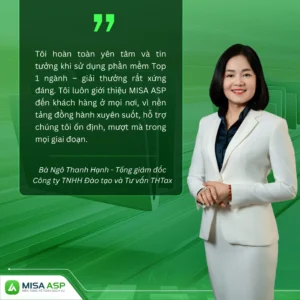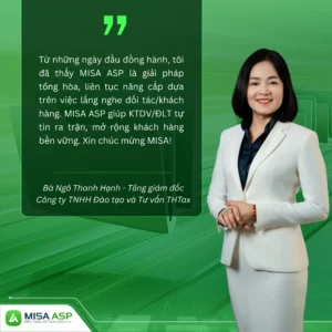 “Khi nghe tin MISA đạt Top 1 Doanh nghiệp Cung cấp Giải pháp Tài chính – Kế toán, tôi rất vui và tự hào, nhưng không quá bất ngờ. Vì với tôi, MISA từ lâu đã là phần mềm kế toán hàng đầu. Tôi luôn đánh giá cao MISA ASP nhờ chất lượng sản phẩm, công nghệ tiên tiến và tinh thần hỗ trợ tận tâm 24/7. Nền tảng mang lại sự thuận tiện, linh hoạt – gần như 100% khách hàng của BHTax hiện đều sử dụng MISA ASP.”