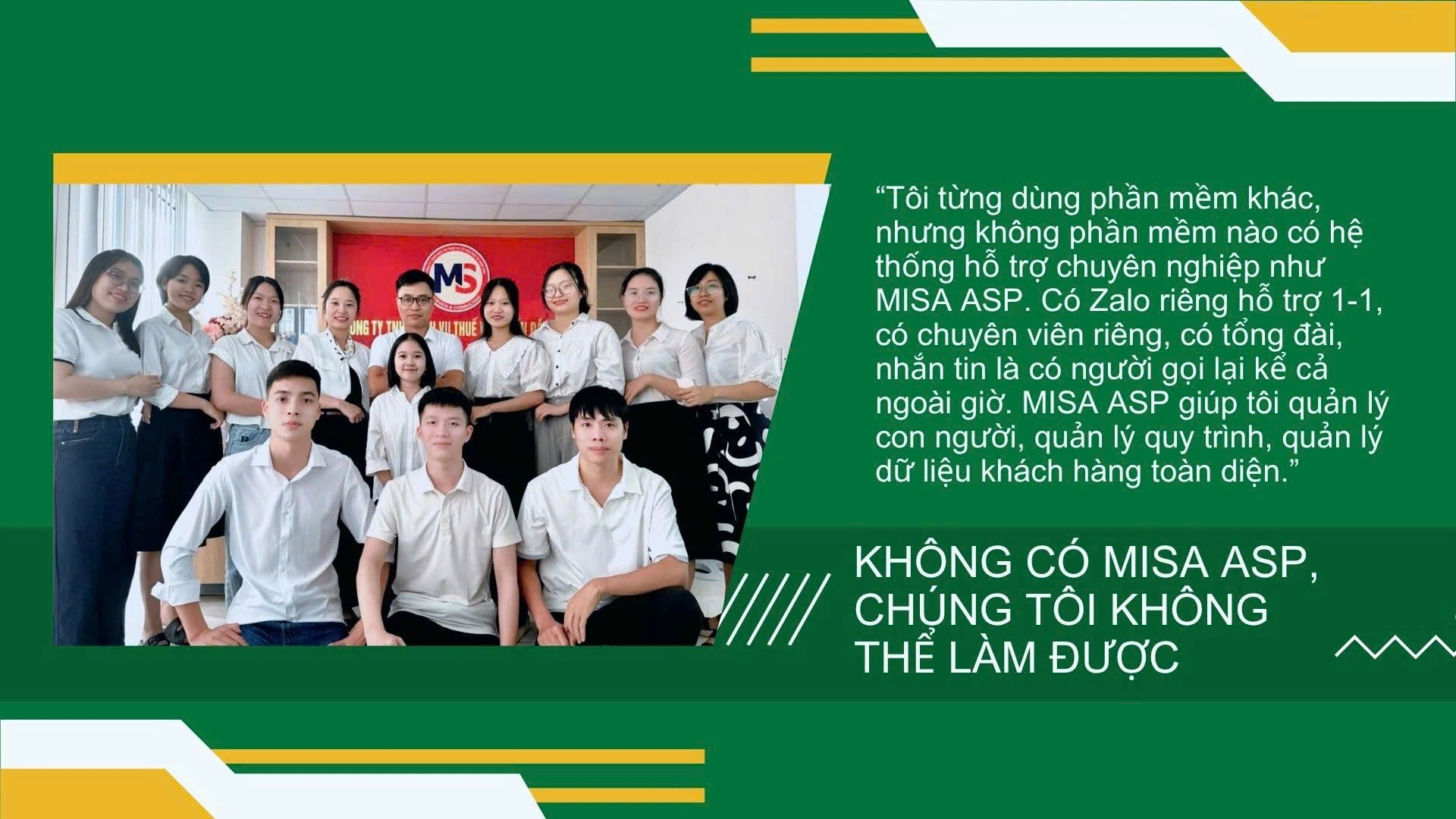 “Tôi từng dùng phần mềm khác, nhưng không phần mềm nào có hệ thống hỗ trợ chuyên nghiệp như MISA ASP. Có Zalo riêng hỗ trợ 1-1, có chuyên viên riêng, có tổng đài, nhắn tin là có người gọi lại – kể cả ngoài giờ. MISA ASP không chỉ giúp nhập chứng từ nhanh hơn. Mà quan trọng là nó giúp tôi quản lý con người, quản lý quy trình, quản lý dữ liệu khách hàng một cách toàn diện.”